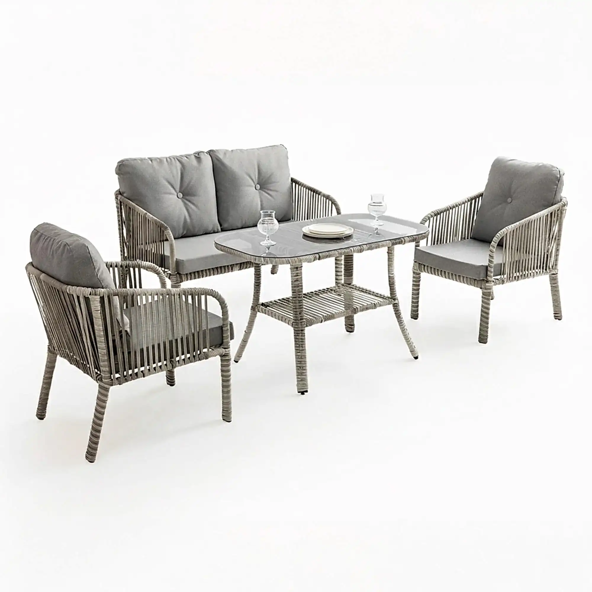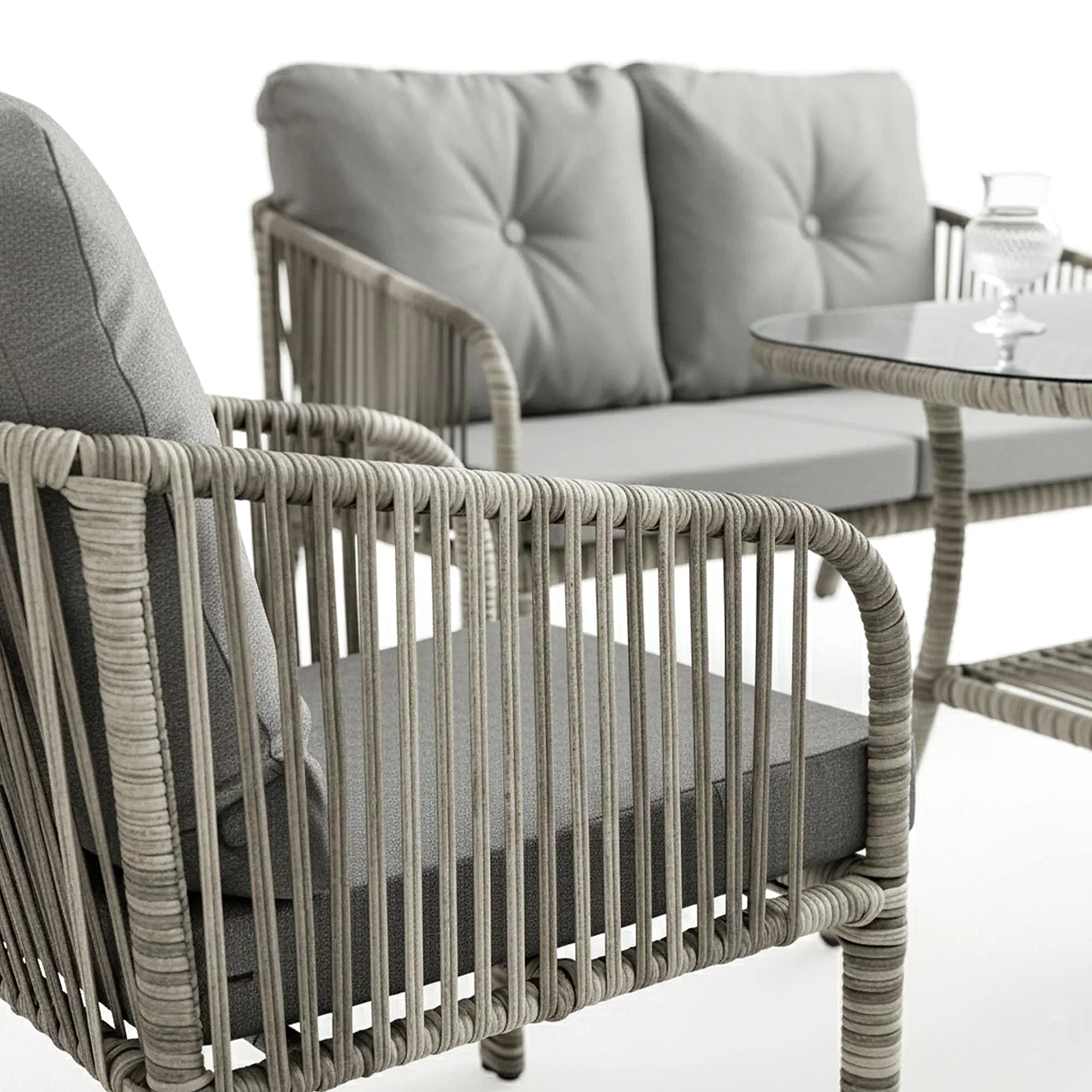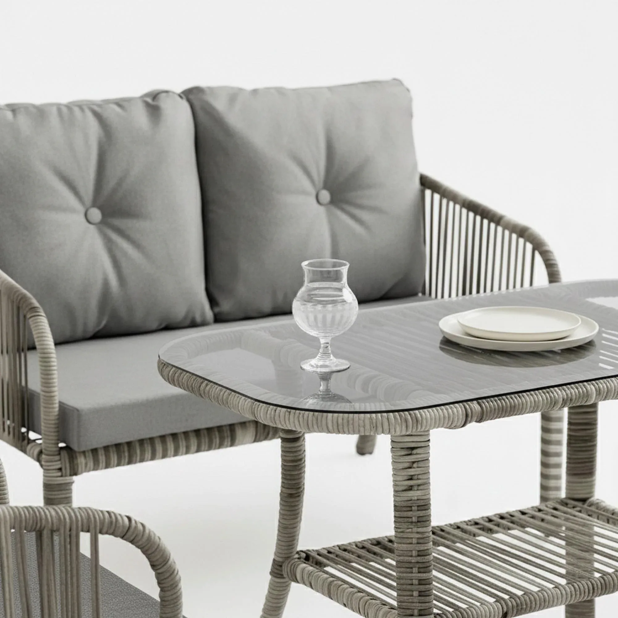 Artemis bahçe takımı, 2 kişilik geniş bir kanepe, 2 adet tekli koltuk ve şık bir sehpa ile eksiksiz bir oturma grubu sunar. Yumuşak dolgulu oturma ve sırt minderleri, uzun süreli oturmalarda konforu maksimize ederken, ergonomik kolçak tasarımı rahat bir oturma deneyimi sağlar. Şık cam detaylarıyla tamamlanan sehpa, içeceklerinizi ve atıştırmalıklarınızı koymanız için hem estetik hem de kullanışlı bir yüzey sunar.