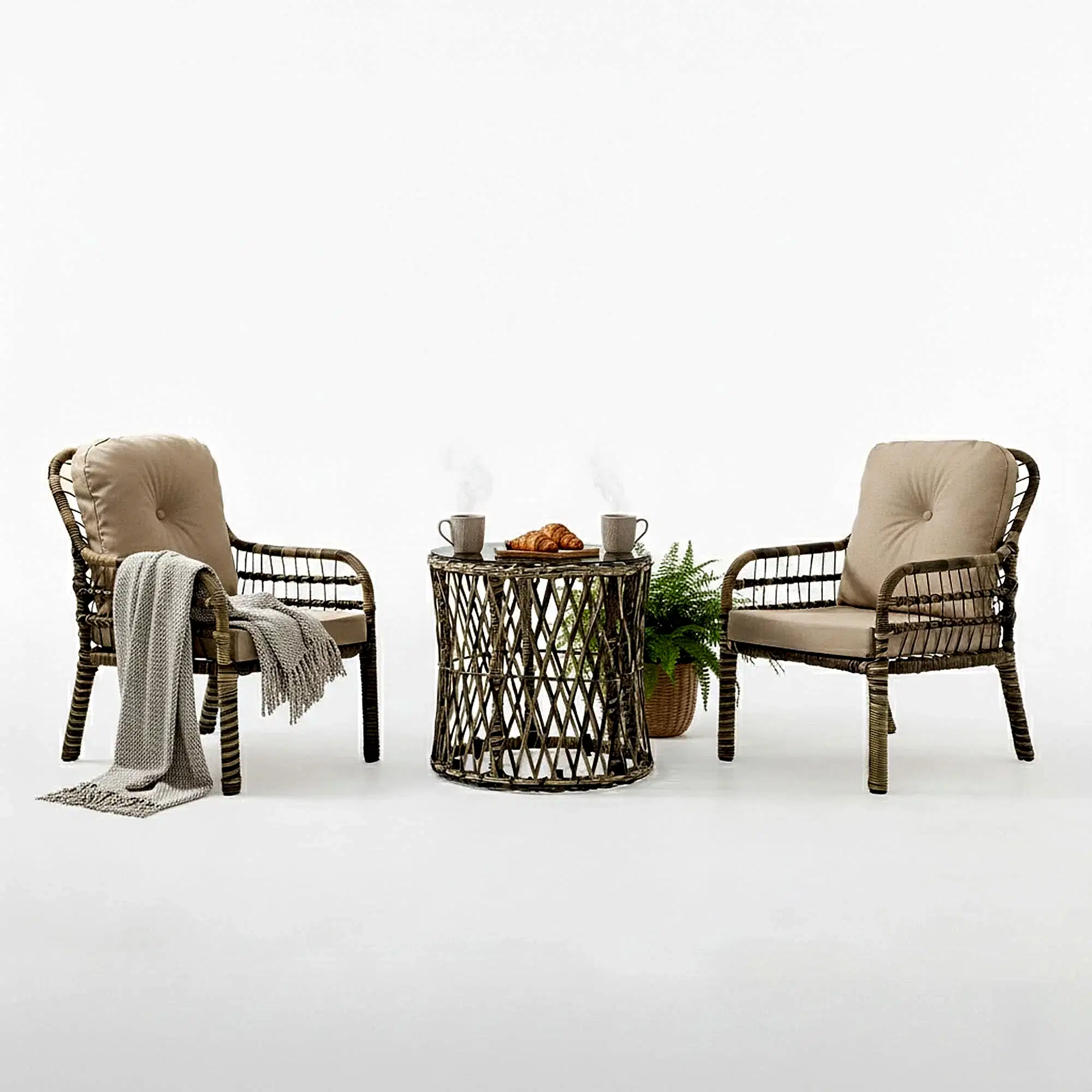 Capri Swing Pisa Tekli Rattan Bahçe Balkon Oturma Grubu; 2 adet tekli koltuk ve 1 adet sehpadan oluşan, balkon ve bahçe kullanımı için tasarlanmış kompakt ve konforlu bir oturma grubudur.
