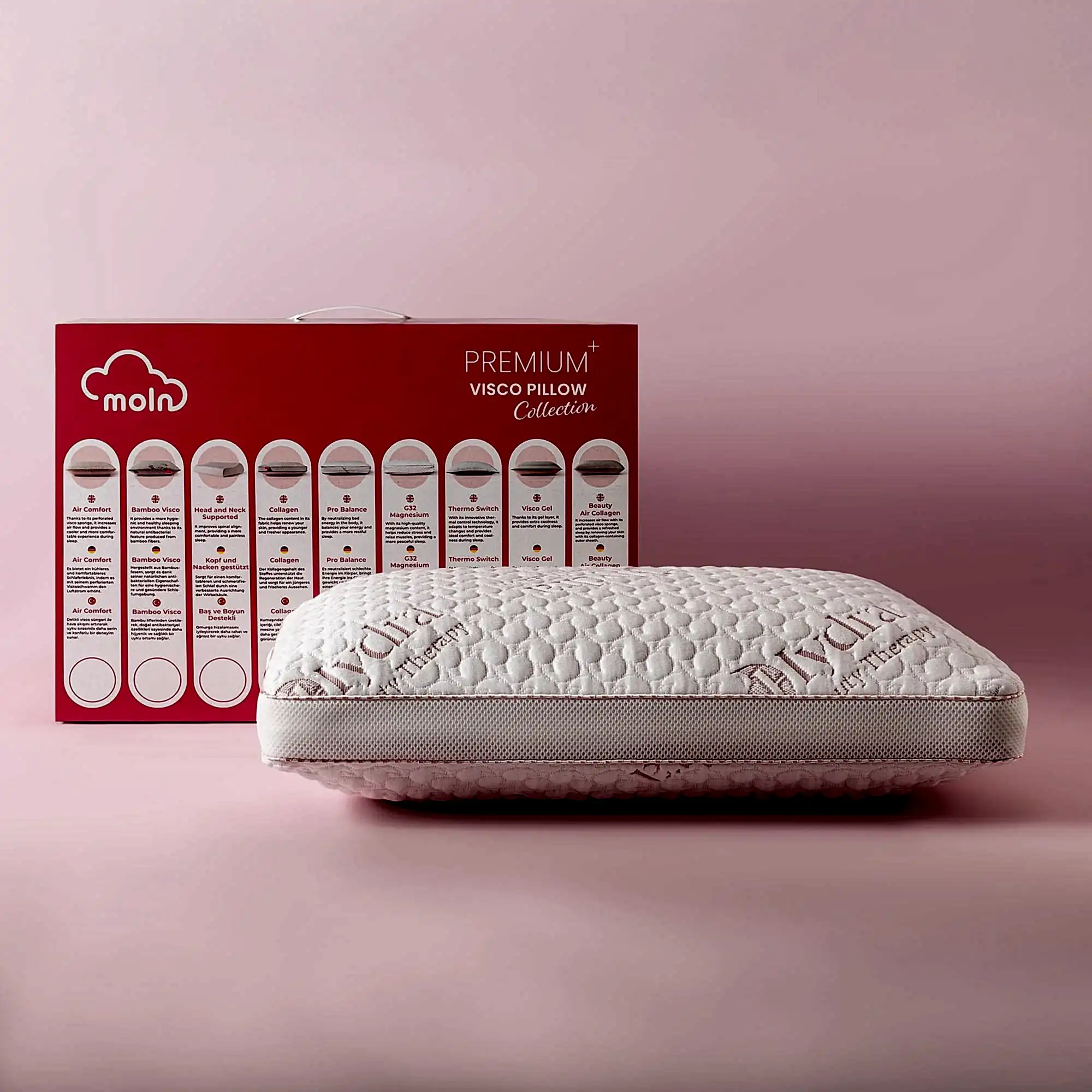 Hyaluronik asit, kolajen ve Koenzim Q10 içeren özel kumağı sayesinde cildinize uyku boyunca nem, esneklik ve yenilenme desteği sunar. Üstelik visco teknolojili iç yapısı, boyun ve omurga hizasını dengelerken konforlu bir uyku deneyimi sağlar.