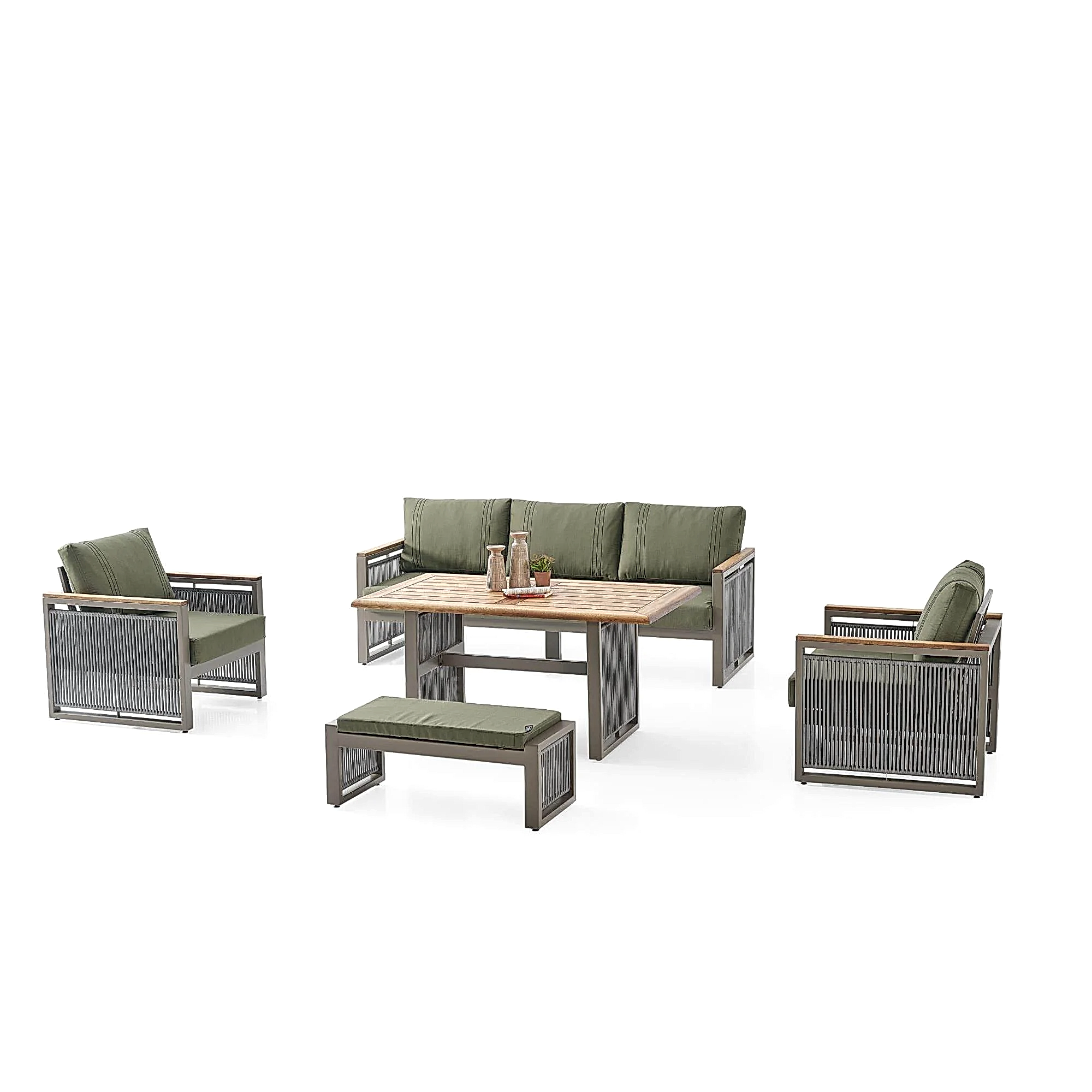 Bu dış mekan mobilya seti, dayanıklılık ve zarafetin en üst seviyesini temsil eder, zorlu çevresel koşullara dayanacak şekilde tasarlanmış olup, zamansız stil ve eşsiz konfor sunar. Her bir bileşen, dış mekan yaşamında en yüksek standartları karşılamak amacıyla titizlikle seçilmiş ve mühendislik ürünü olarak geliştirilmiştir. Bu sayede mobilyalarınız sadece dış mekan alanınızı güzelleştirmekle kalmaz, aynı zamanda yıllar boyu dayanıklılığını korur.