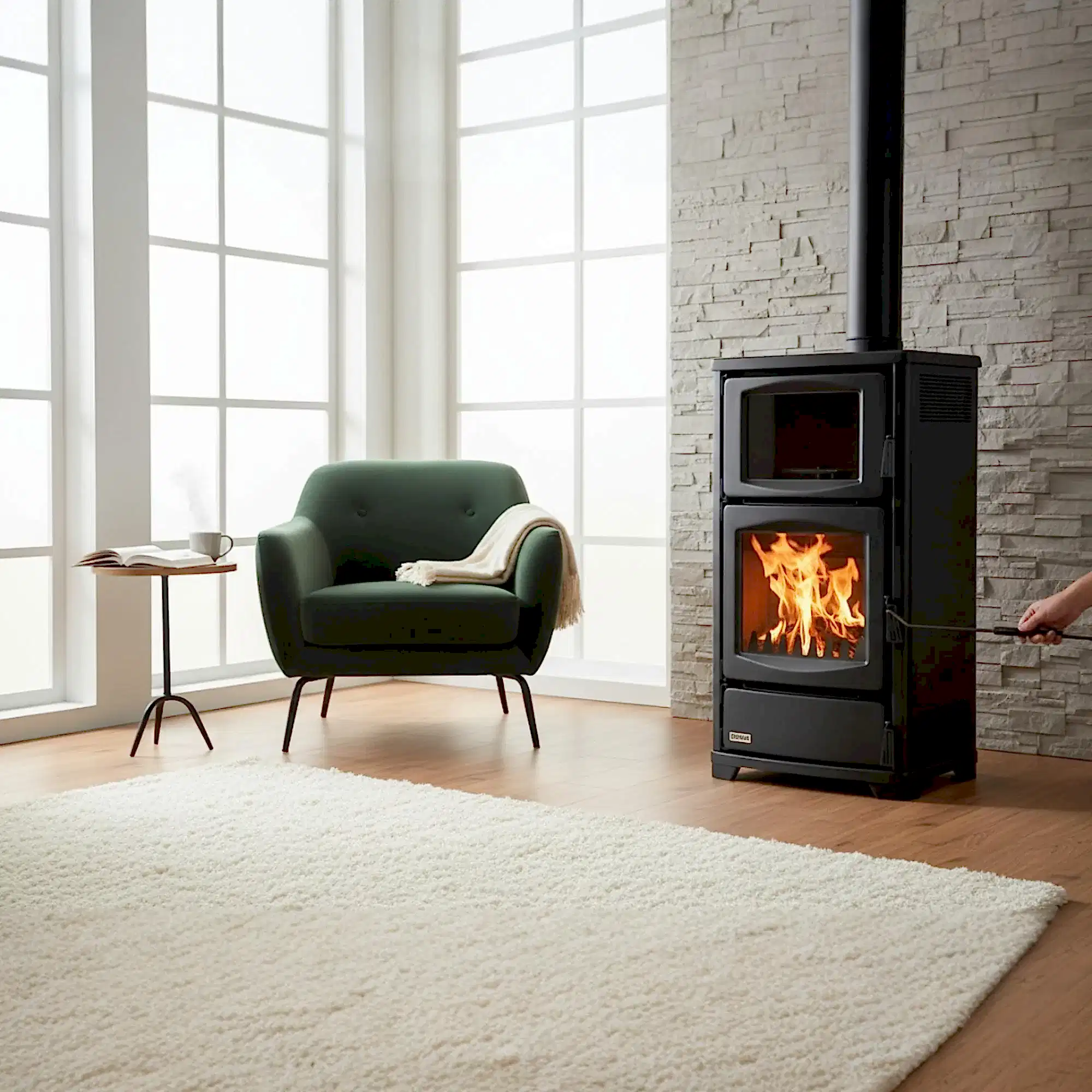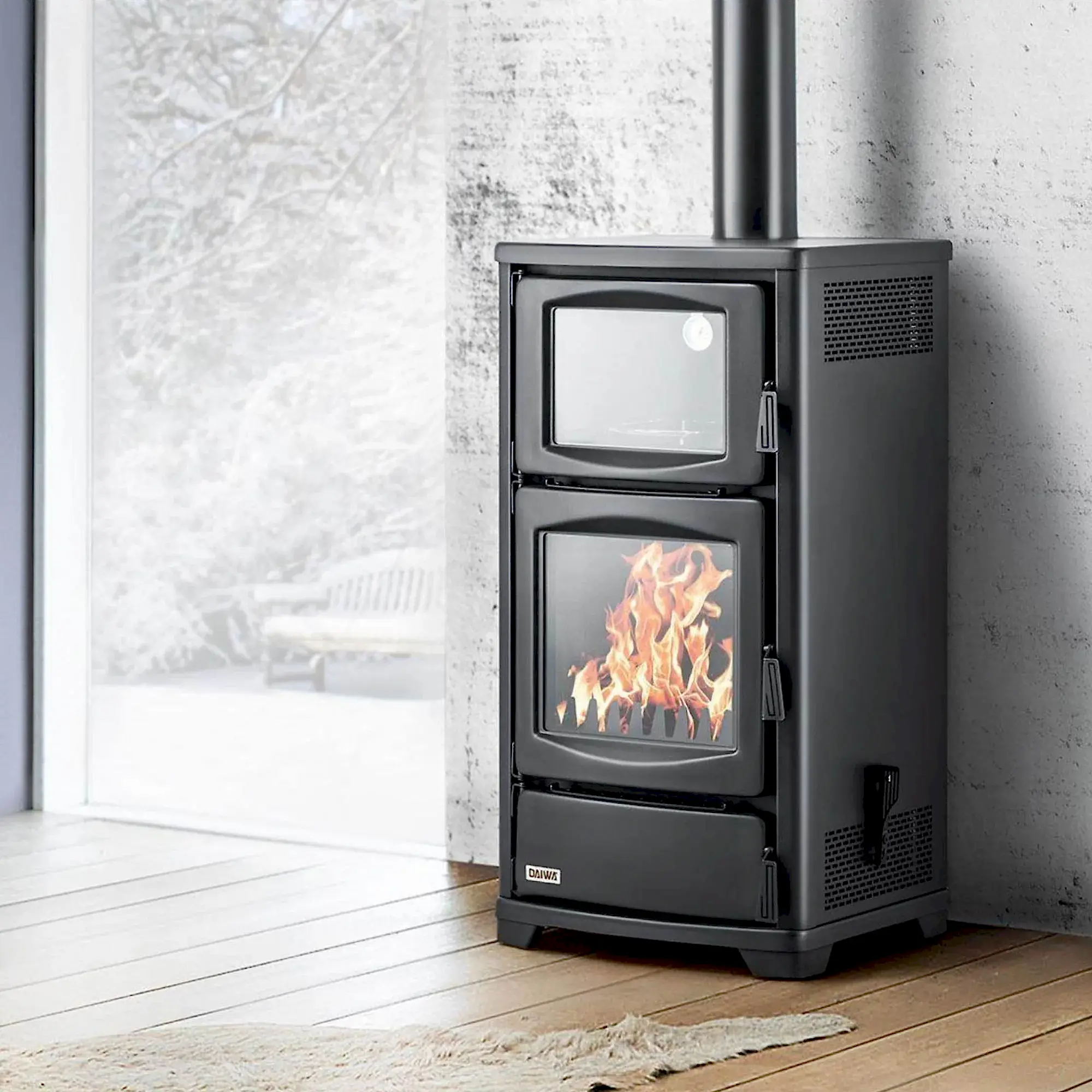 Geniş ön yükleme kapağı odun yerleştirmeyi kolaylaştırır. Isınabilir üst yüzey günlük kullanımlarda yemek veya içecek ısıtmak için pratik alan sunar. Sade, modern hatlarıyla hem rustik hem çağdaş dekorasyonlara uyum sağlar.