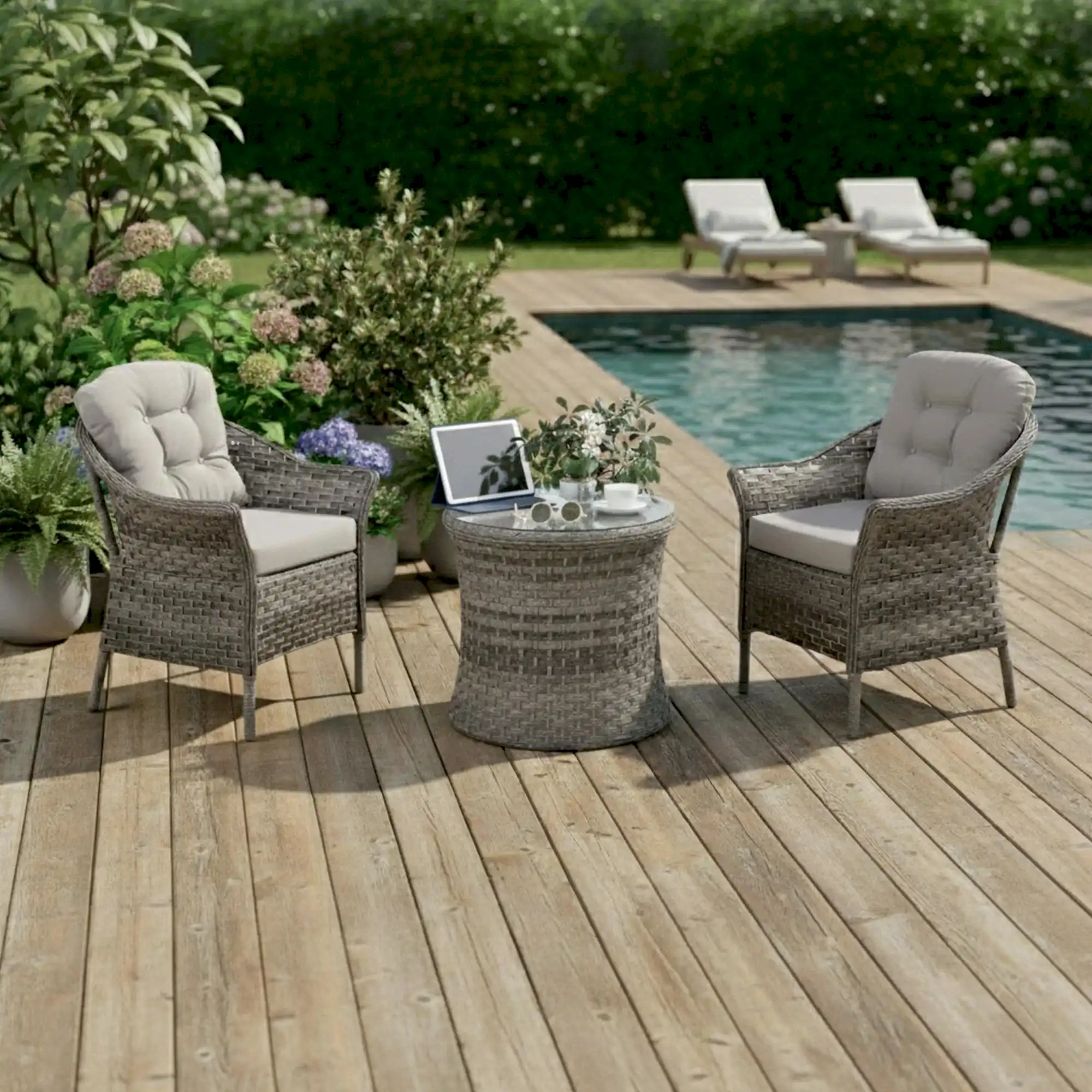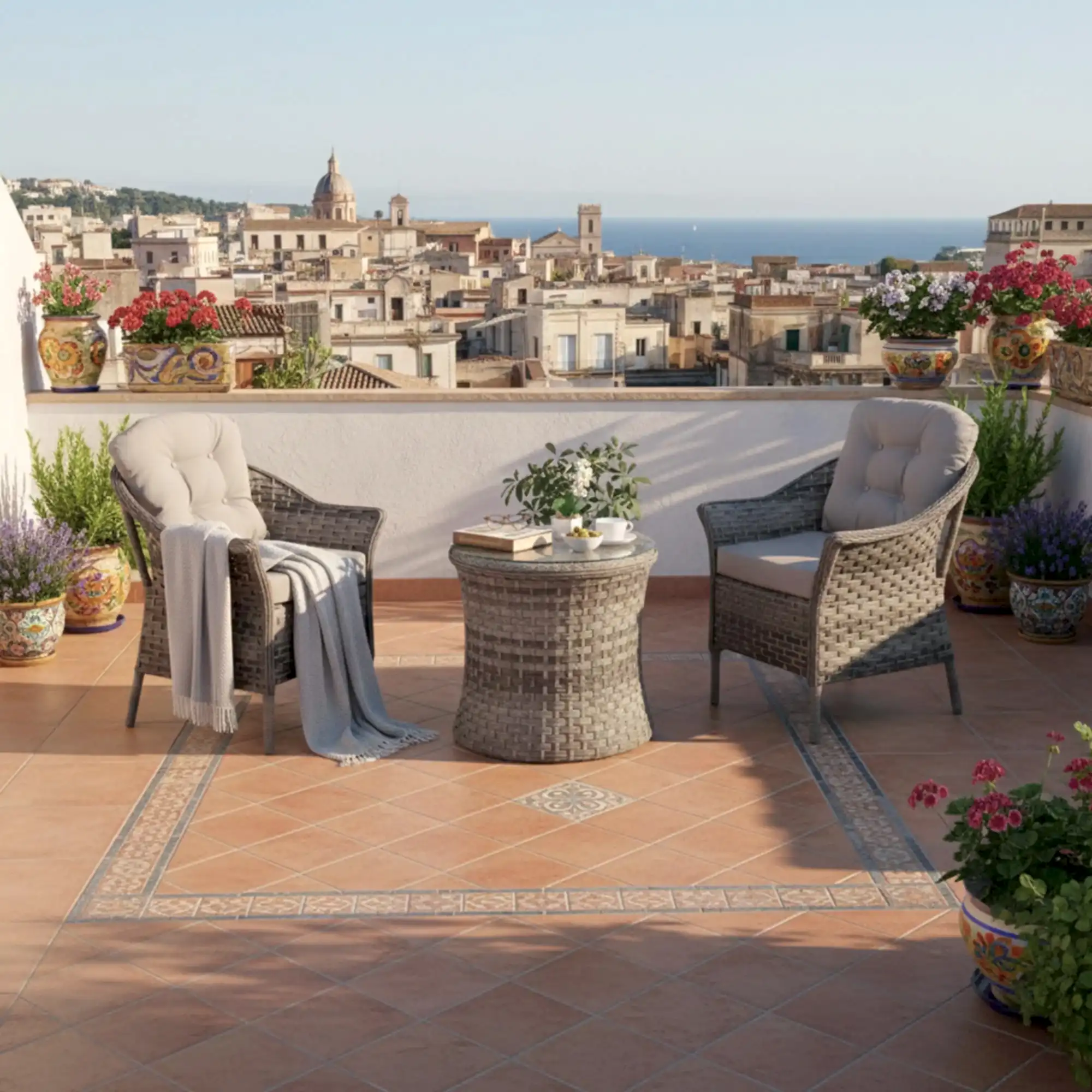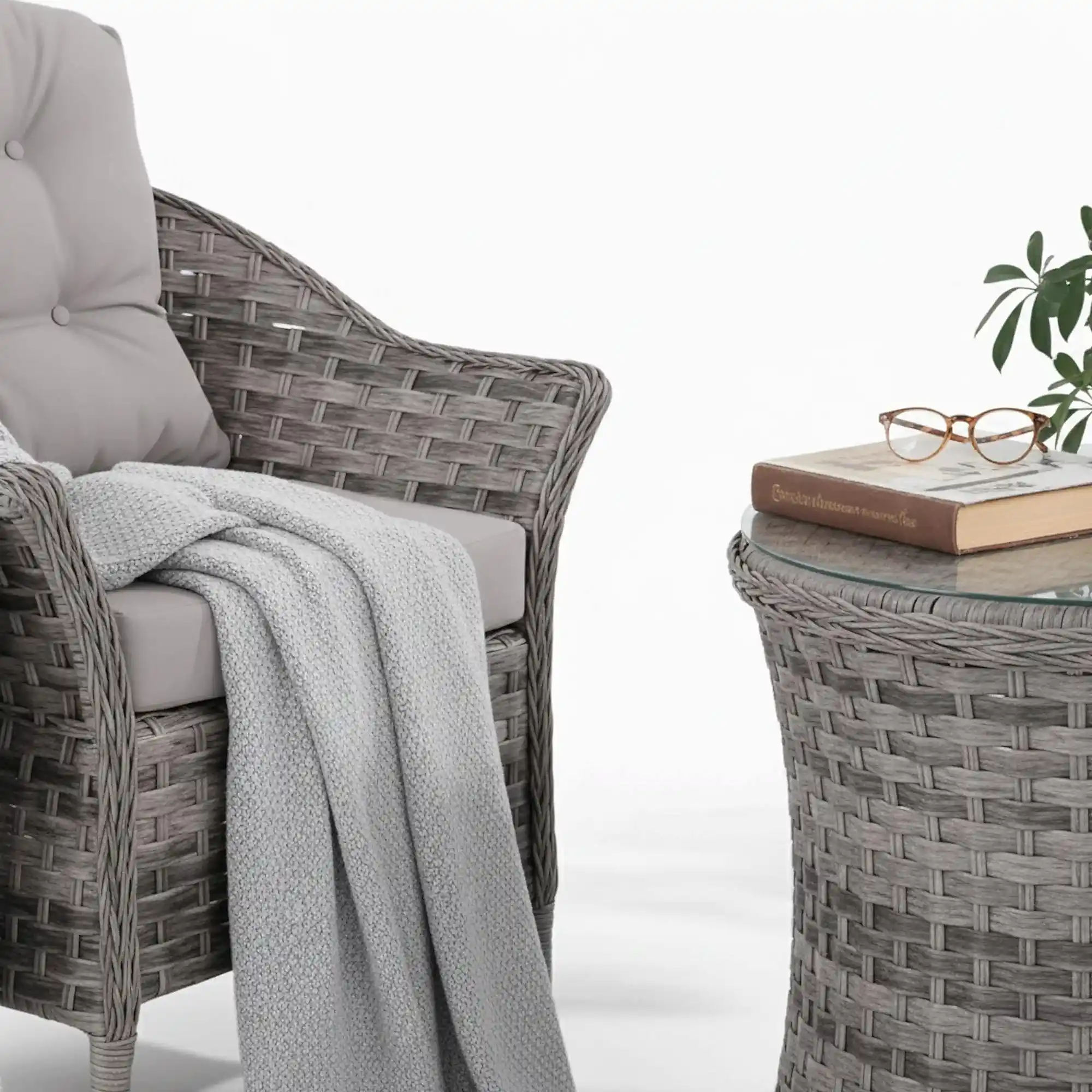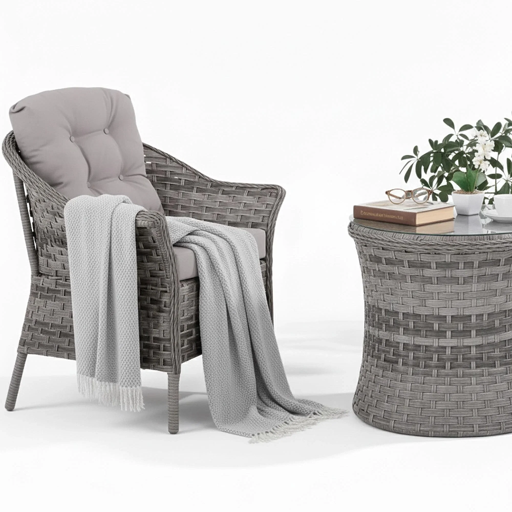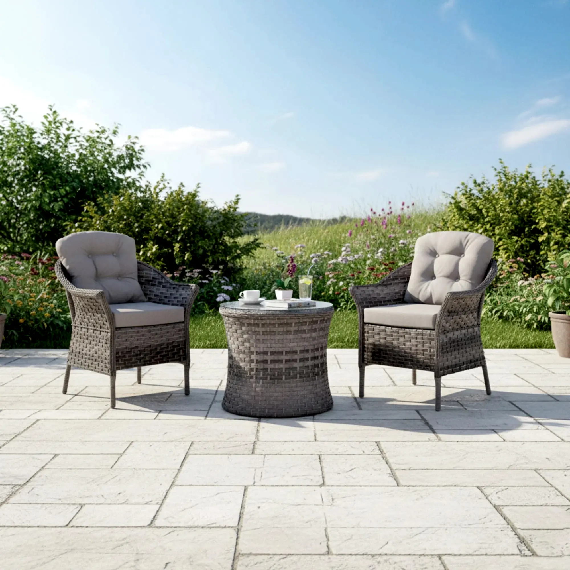 Alüminyum iskelet üzerine uygulanan rattan örgü yapısı sayesinde hafif, dayanıklı ve dış hava koşullarına uygun bir kullanım sunar. Günlük sohbetler, çay saatleri ve kısa dinlenme anları için pratik bir çözümdür.